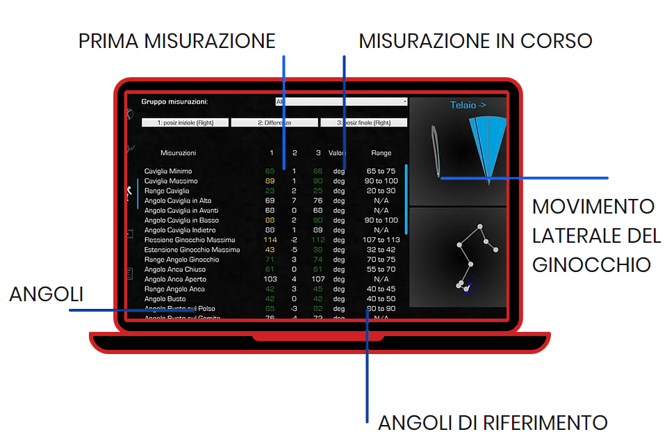Il software retul consente di visualizzare fino a 20 dati cinetici contemporaneamente. Prendendo in esame sia macro movimenti come la flesso estensione del ginocchio (definiti cosi perche eseguono un ampio range di movimento) a quelli piu piccoli come l’oscillazione del bacino e la deviane laterale del piede.