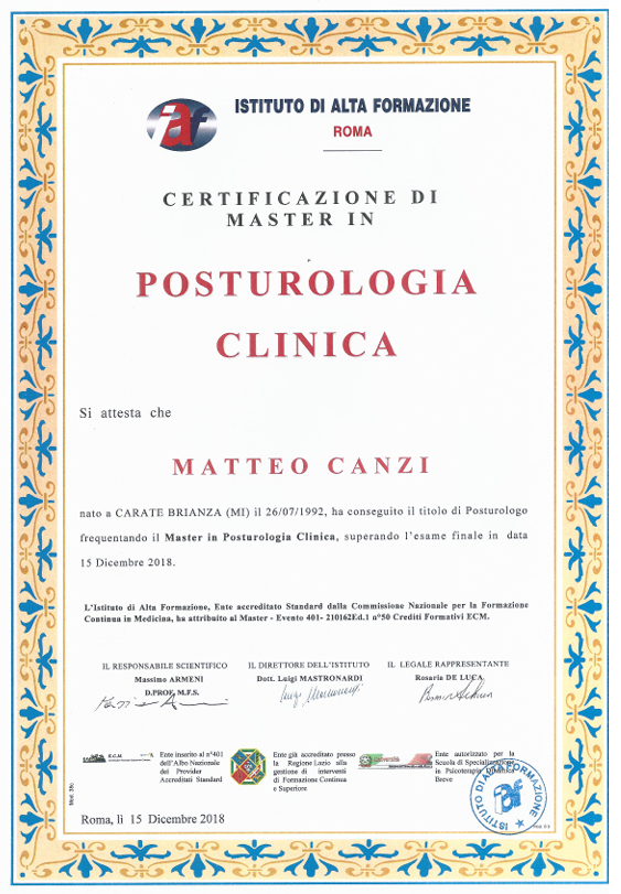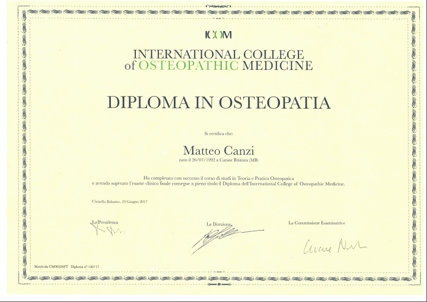 Diplomato in Osteopatia nel 2017 presso ICOM College Cinisello balsamo, nello stesso anno conseguo il master of scienze (MsC) presso la Kingston University, UK. Dopo il conseguimento del diploma ho iniziato a lavorare presso uno studio privato. In seguito, oltre a partecipare a vari seminari ho continuato gli studi presso l’Istituto di Alta Formazione a Roma, conseguendo il master in Posturologia Clinica. Nel luglio del 2021 ho ottenuto il diploma di Massaggiatore Massofisioterapista, presso l’istituto Enrico Fermi di Perugia. Dal 2022 sono Osteopata e Massofisioterapista della Nazionale Italiana di Ciclismo maschile.
